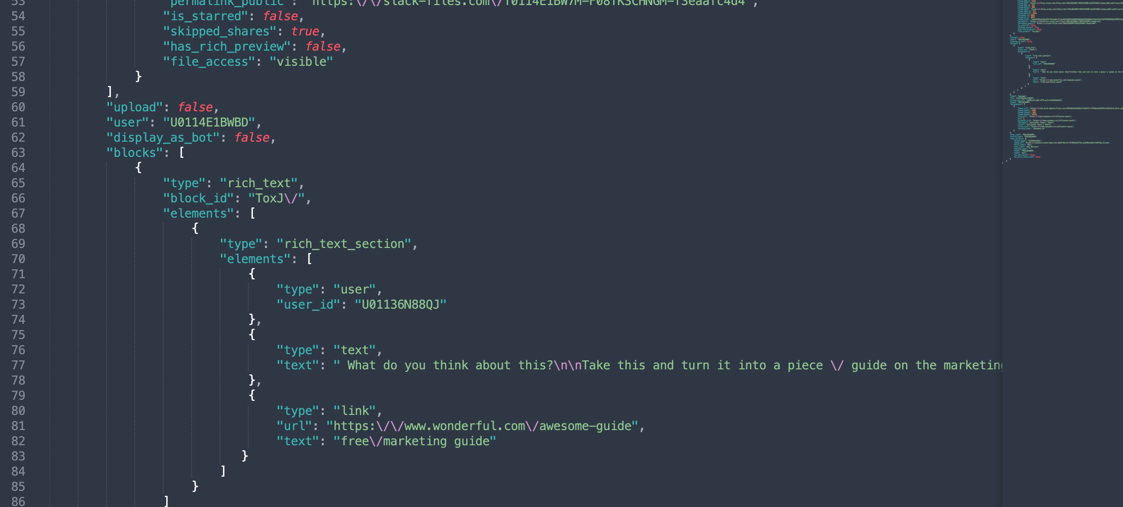 Example JSON code from a Slack export file