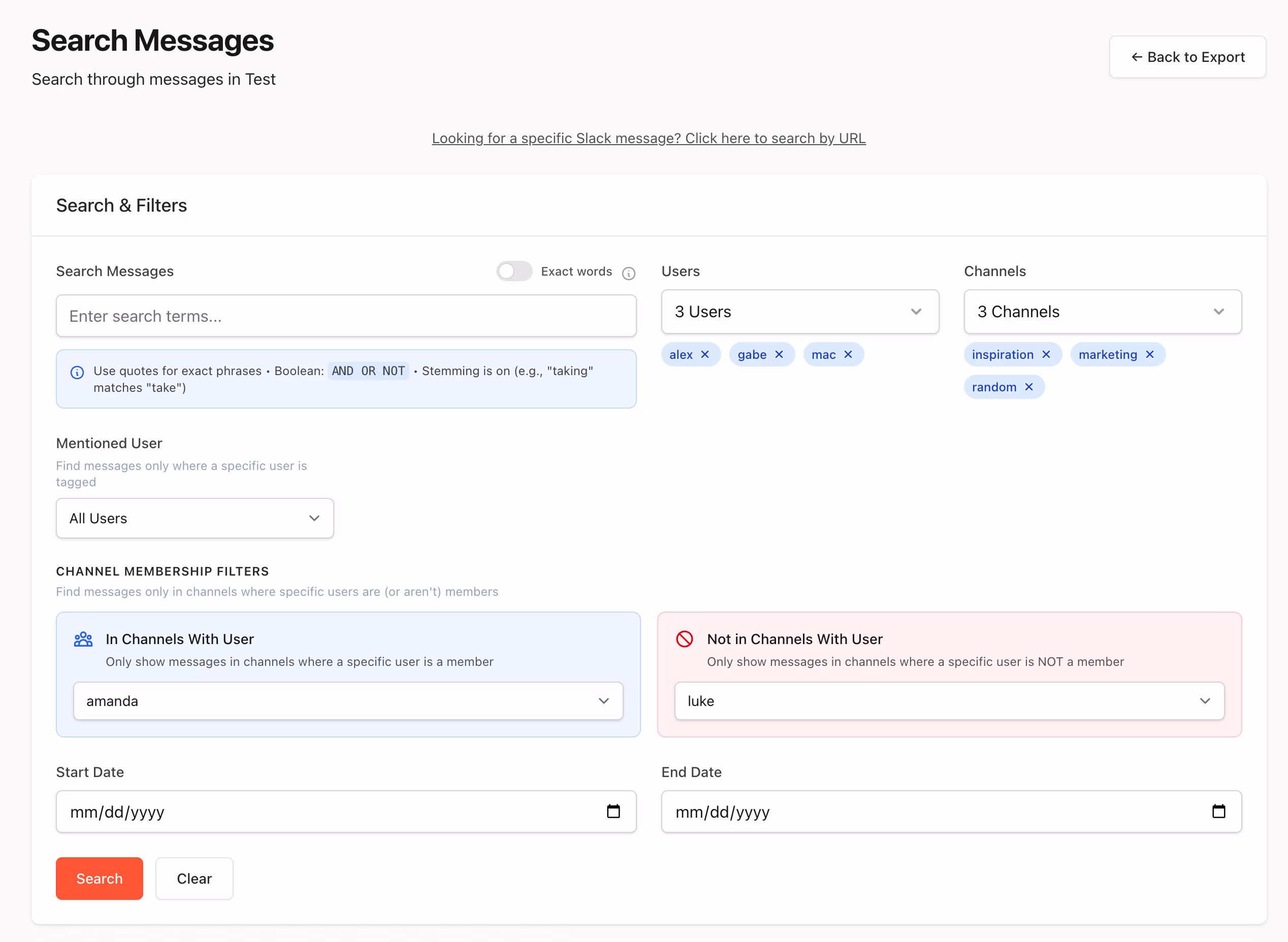 2. Enter keywords, and (optionally) date range, channels where user (custodian) is present or other users (custodians) not present, or messages sent by a particular Slack user