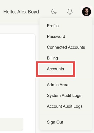 Click "Accounts" to view your workspaces, add and manage team members, and set roles and permissions: