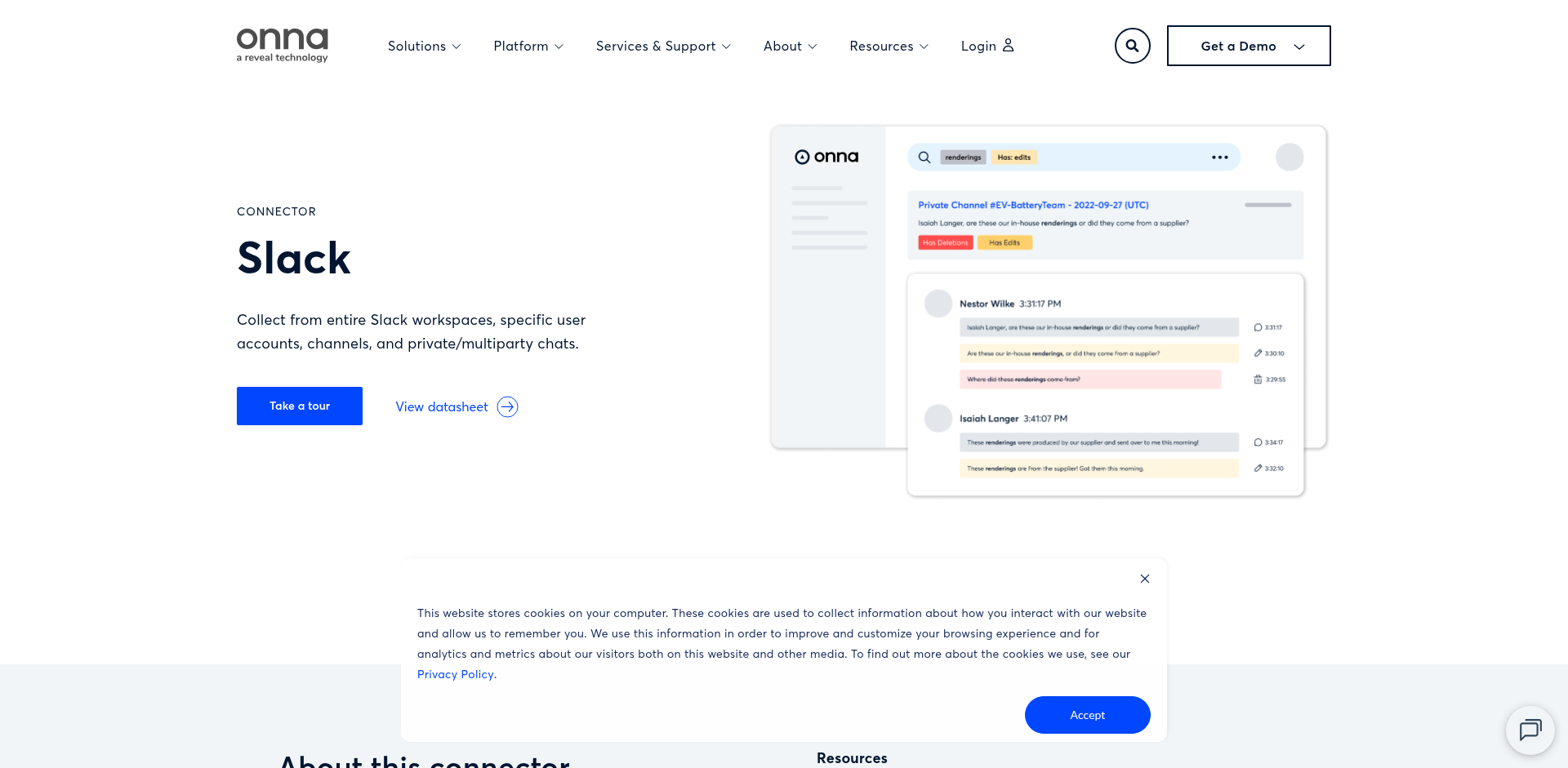 Deep Slack Collection: The integration goes beyond simple message scraping. Onna captures a comprehensive record of Slack activity, including public and private channels, direct messages, edits, deletions, reactions, and all associated files and metadata.