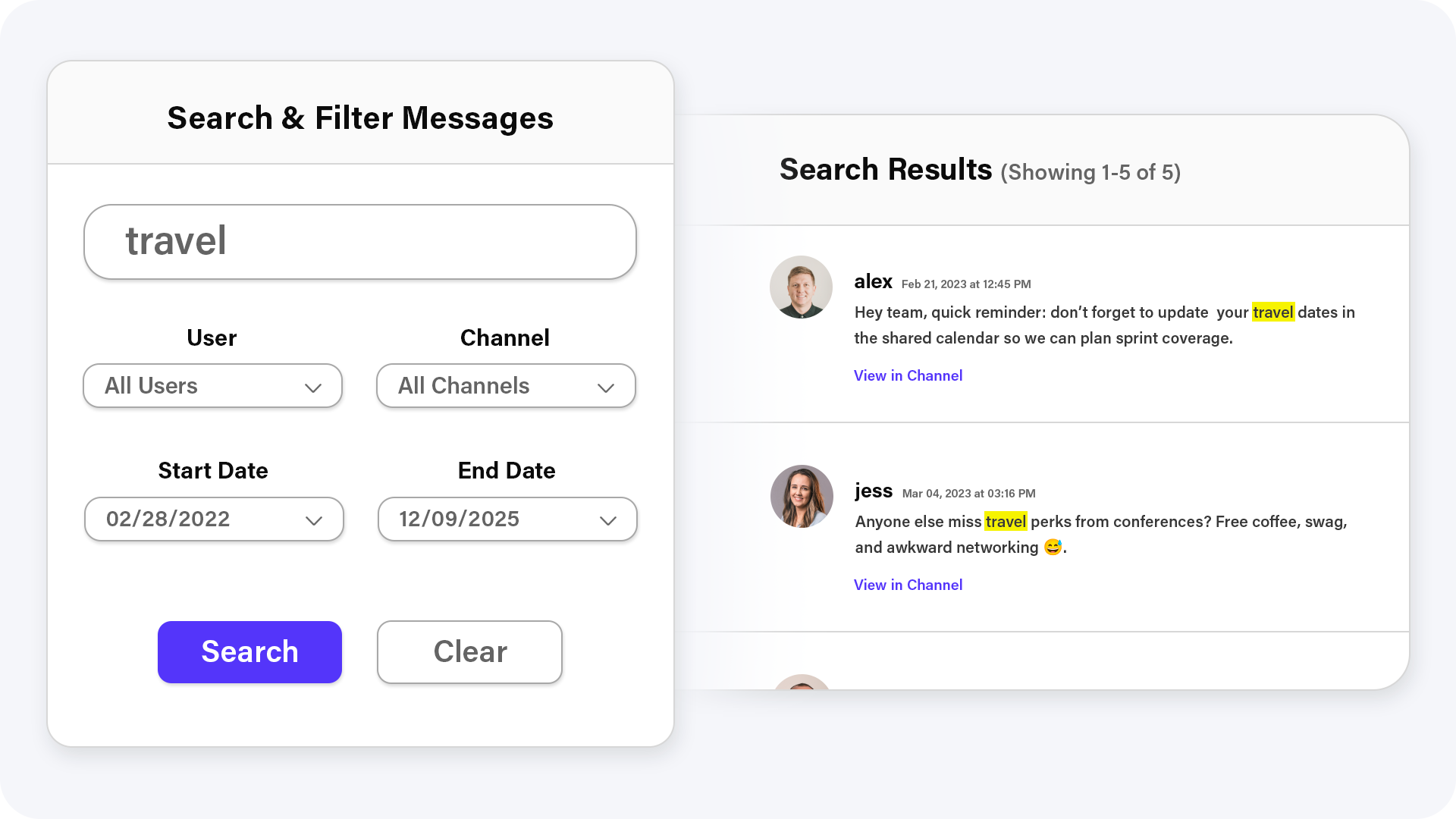 Legal and IT teams hit walls fast: no way to filter by date range, no way to search across DMs or private channels without triggering "joined channel" alerts, and no way to make sense of raw JSON files without hours of manual effort.