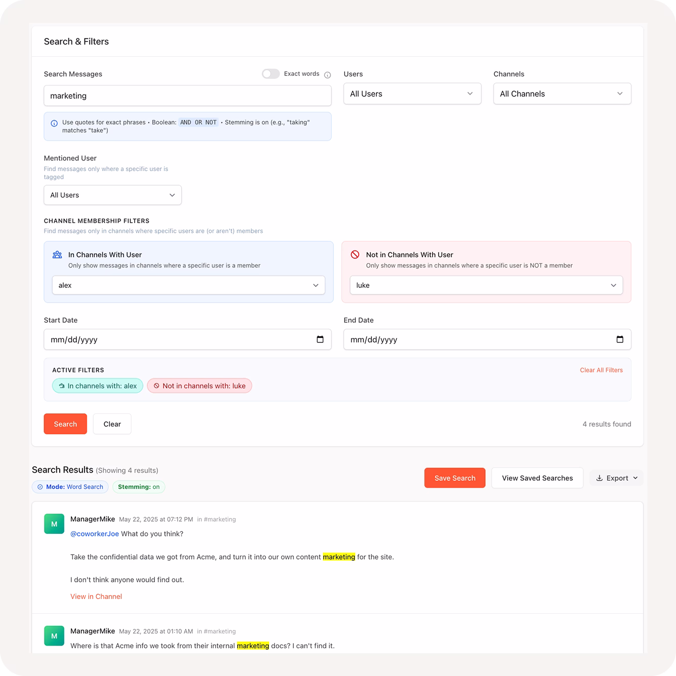 Filtering Slack messages by date range isn’t easy natively, making scoped legal hold implementation, compliance exports, audit prep, and ECA slow and error‑prone.